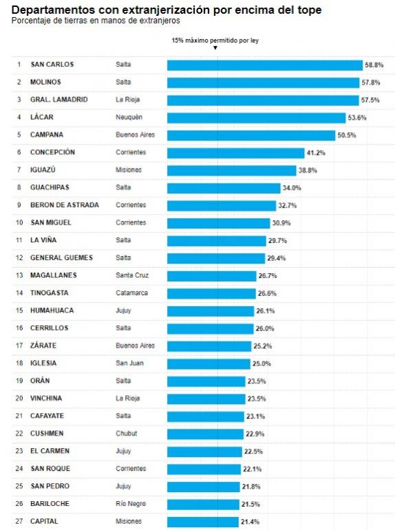 Las dos localidades con mayor nivel de extranjerización del país son salteñas. Se trata de San Carlos, un área declarada “lugar histórico nacional” en los Valles Calchaquíes (con el 58% de su territorio extranjerizado), y el departamento de Molinos (con el 57% de extranjerización). En el primer caso, la mayoría de las tierras extranjerizadas está en manos de una sociedad radicada en Uruguay, mientras que en el segundo un 47% está en manos de estadounidenses y otro 10% en manos suizas.