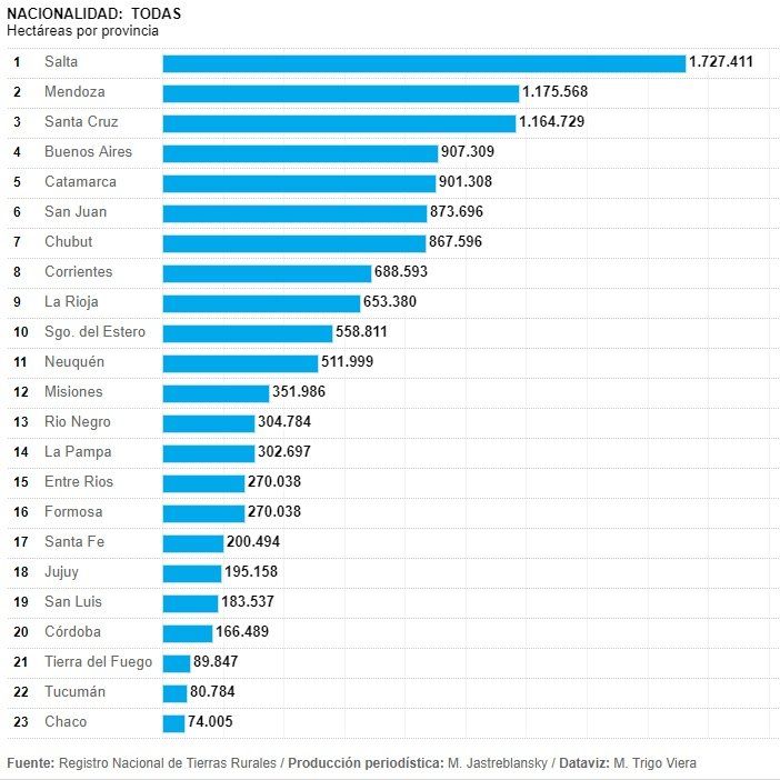 Tras una minuciosa investigación de Maia Jastreblansky para Chequeado en base a datos del Registro Nacional de Tierras Rurales (RNTR), se conoció que más de 12,5 millones de hectáreas del país están en manos de extranjeros. Casi 200 mil pertenecen a la provincia de Jujuy.