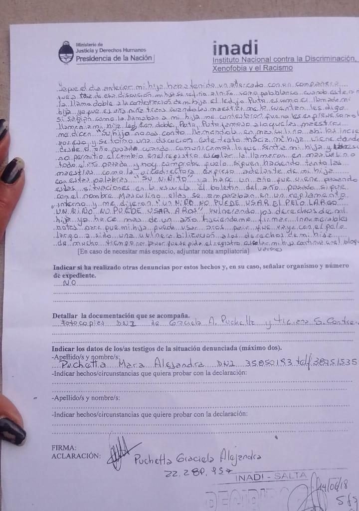 Puchetta decidió ir a hablar con la vicedirectora y para su sorpresa, la autoridad se refirió a Tiziana como “niñito”. “Mi hija tiene un documento, pero no lo necesita para que respeten sus derechos, por eso, fui a hacer la denuncia al INADI“, sostuvo.