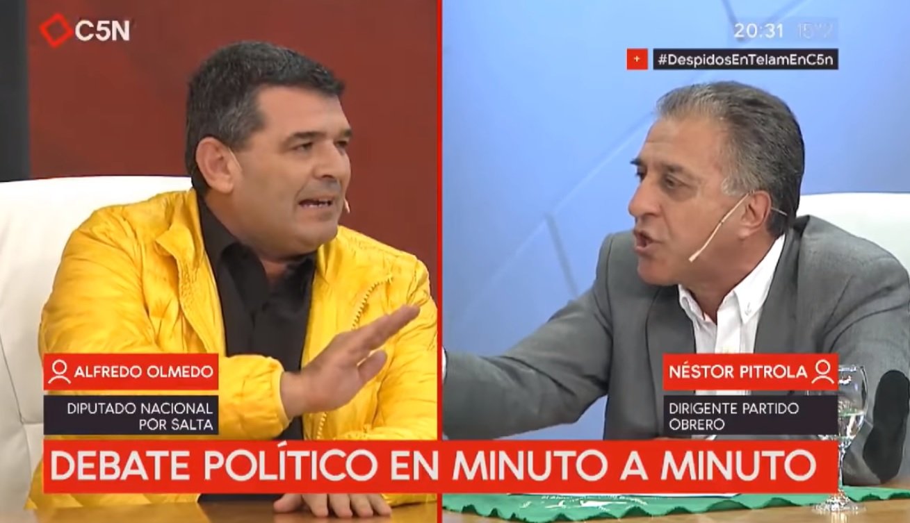 El diputado, aliado del macrismo, Alfredo Olmedo buscó provocar al dirigente del Partido Obrero Néstor Pitrola insinuando que no sabía pagar cargas sociales de trabajadores porque “nunca probó trabajar”. Pitrola montó en cólera, le respondió con vehemencia y recibió la solidaridad de Jorge D´Onfrio, diputado de Frente Renovador que acusó al salteño de “cachivache”. Cristian Castillo se plegó y dijo: “¿Usted se cree que la gente no se acuerda que hace muy poquitito a usted Olmedo lo compraron con el quorum?”, en referencia a la bochornosa actuación del diputado durante el debate por la legalización del aborto.
