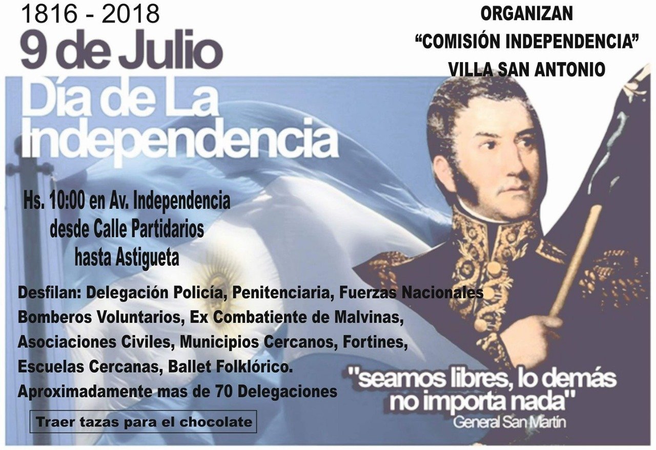 La Comisión Independencia Villa San Antonio invita a un desfile gratuito con chocolatada que se realizará el 9 de julio, Día de la Independencia, a partir de las 10 hs. en Av. Independencia desde calle Partidarios hasta Astigueta.