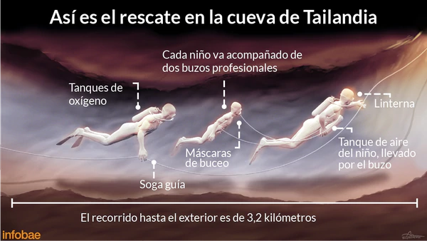 Los extraviados recibieron alimentos, sábanas y clases de buceo en los días previos al inicio del rescate. El proceso se está haciendo de la siguiente manera: los buzos profesionales recorren los 3,2 kilómetros de ida que separan el campamento base del lugar en el que están los niños. A continuación, cada niño rescatado es equipado correctamente y escoltado por dos o tres buzos en su viaje de vuelta. Por suerte para todos, la operación se está resolviendo con mayor agilidad porque hay tramos en los que pudieron caminar por los pasillos estrechos del interior de la gruta. Las lluvias monzónicas no están siendo tan agresivas como apuntaron los pronósticos, por lo que el trayecto no tuvo que ser exclusivamente bajo el agua. Estas son las cuatro herramientas esenciales que están utilizando los rescatistas para llevar a tierra firme a los niños.