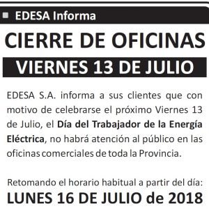 EDESA S.A. informa a sus clientes que con motivo de celebrarse el próximo Viernes 13 de Julio, el Día del Trabajador de la Energía Eléctrica, no habrá atención al público en las oficinas comerciales de toda la Provincia.