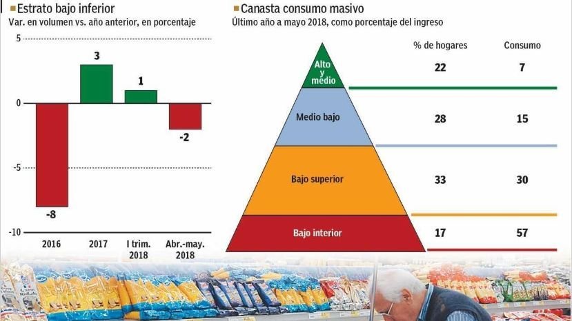 “La recuperación del consumo en los hogares de menores recursos, que se observó en el 2017 y en el primer trimestre de este año, se frenó abruptamente en el transcurso de los meses de abril y mayo. El nivel bajo inferior, que nuclea el 17% de los hogares, había recuperado un 3% de volumen durante el año pasado y otro 1% entre enero y marzo del 2018, pero entre abril y mayo esas mejoras se licuaron, puntualizó el director comercial de la consultora, Federico Filipponi.
