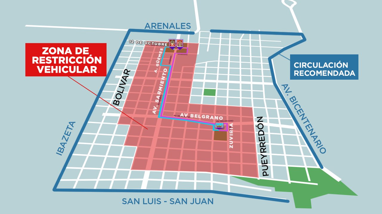 El sábado 15, a partir de las 12 de la noche, no se permitirá el estacionamiento de vehículos en inmediaciones de plaza 9 de Julio. A partir de las 7 de la mañana, se procederá a despejar la zona del recorrido de la procesión: