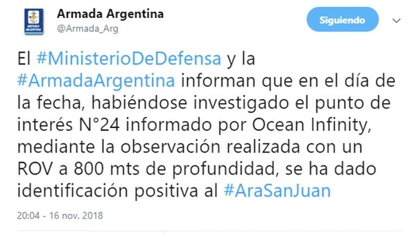 “El Ministerio de Defensa y la Armada Argentina informan que en el día de la fecha habiéndose investigado el (Punto Dato) POI 24 informado por la empresa Ocean Infinity, mediante la observación realizada con un ROV (vehículo de observación remota) a 800 mts de profundidad, se ha dado identificación positiva al submarino ARA San Juan”, señaló un breve comunicado.