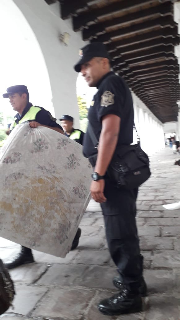 Por las inclemencias climáticas de esta mañana el grupo originario decidió refugiarse debajo del techo del Cabildo. Al rato llegó la policía y los desalojó trasladando sus cosas al gazebo que habían montado en la plazoleta.