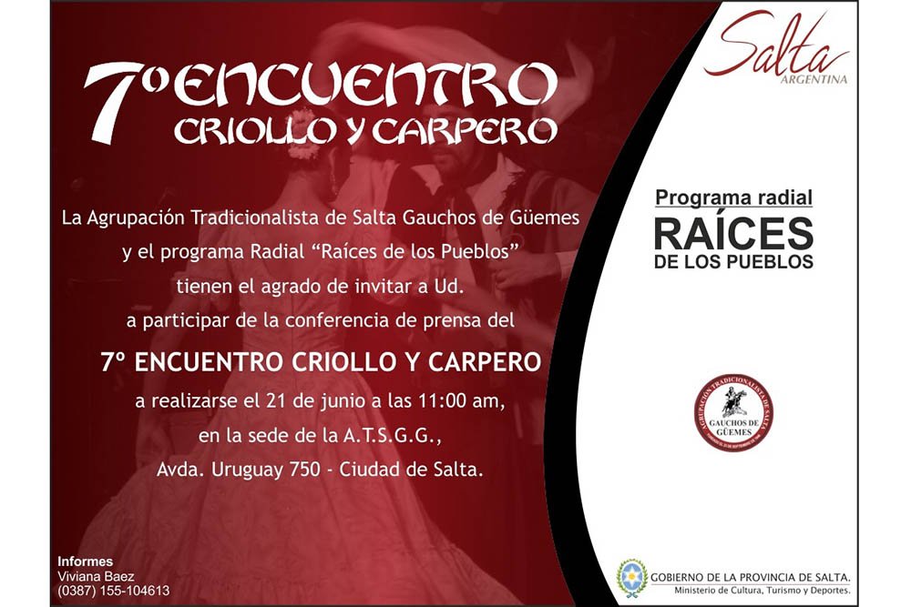 El 7º Encuentro Criollo y Carpero, organizado por el programa “Raíces de los Pueblos” con el apoyo del Ministerio de Cultura, Turismo y Deportes, se presentará mañana viernes 21 a las 11 en la sede de A.T.S.G.G., Avda. Uruguay 750.