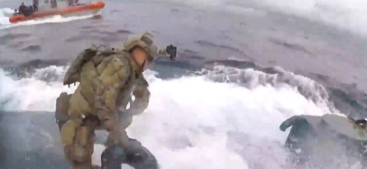 El jefe de la operación, a bordo de la embarcación de la Guardia Costera, es quién en el video indicó a los narcotraficantes que detuvieran la marcha, justo antes de que el resto del equipo salte hacia el vehículo.