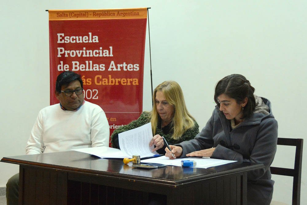 La ministra de Producción, Trabajo y Desarrollo Sustentable, Graciela Pinal de Cid encabezó la firma de un nuevo convenio de cooperación con la rectoría de la Escuela Provincial de Bellas Artes Nº 6002 “Tomas Cabrera” para que alumnos de la institución diseñen logos de marcas de productores, cooperativas y asociaciones para la promoción y comercialización de sus productos.