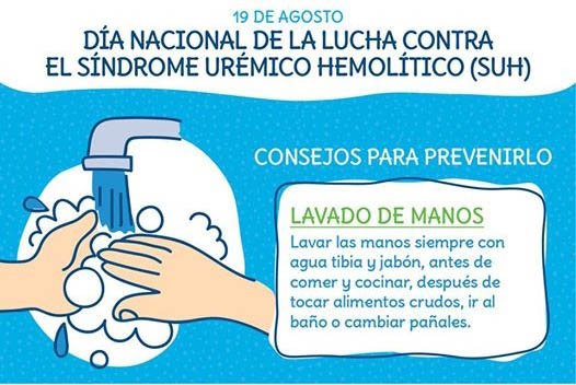 El 19 de agosto es el Día Nacional de Lucha contra el Síndrome Urémico Hemolítico (SUH), jornada dedicada a intensificar la información sobre esta enfermedad, que afecta principalmente a niños, adolescentes, ancianos y personas inmunodeprimidas, y las formas de prevenirla.