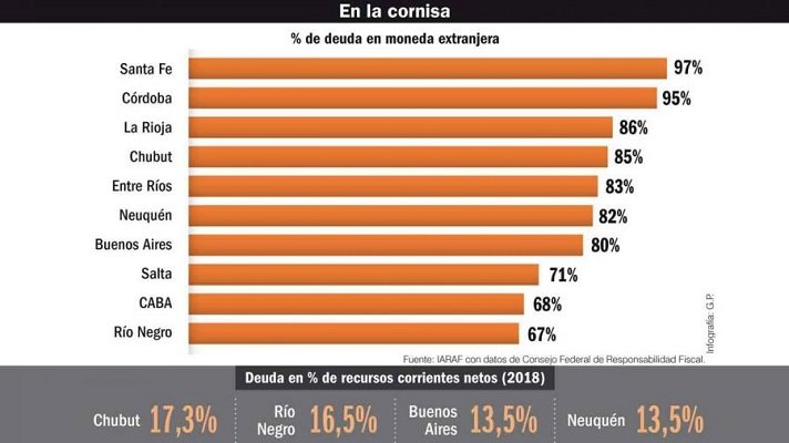 El nivel de endeudamiento en divisas es el factor de riesgo central si la Argentina no recupera el crédito. Las provincias con mayor porcentaje de su deuda nominada en dólares son: Santa Fe (97%), Córdoba (95%), La Rioja (86%), Chubut (85%), Entre Ríos (83%), Neuquén (82%), Bs. As (80%) y Salta (71%).