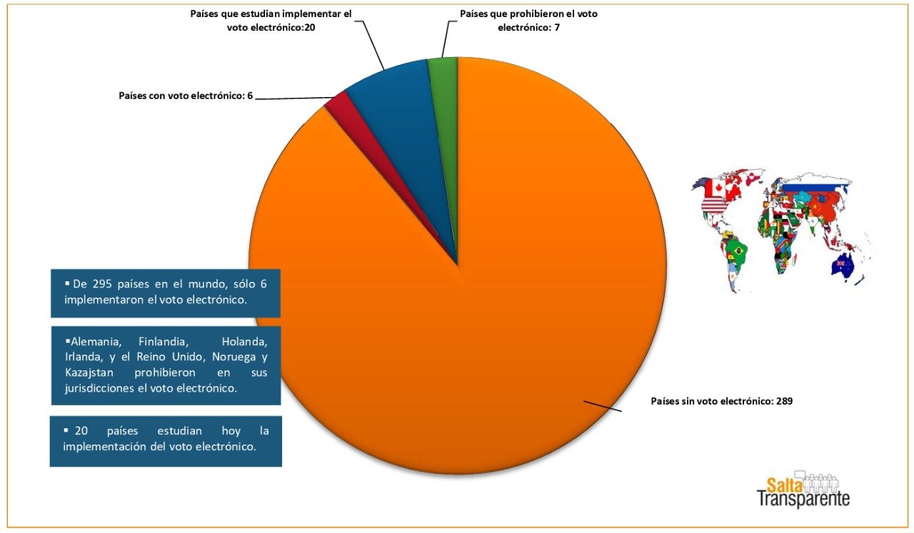 La discusión sobre el voto electrónico en el mundo se encuentra saldada en cuanto a su amplio rechazo. Al tomar los 243 Estados existentes -entre independientes de hecho, soberanos y especiales- sólo el 2,88 por ciento avaló someter su votación a las máquinas.