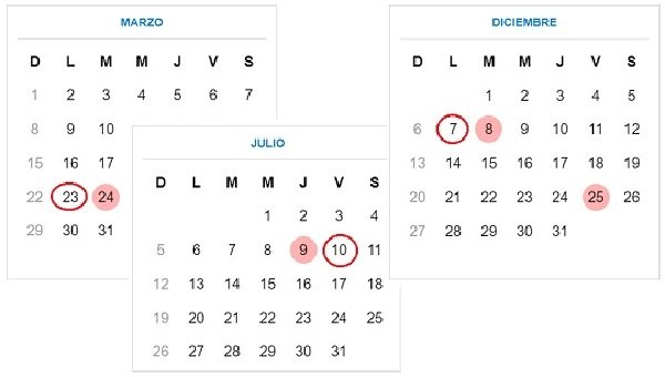 Como el 23 de marzo y el 7 de diciembre caen lunes, y son anteriores a los feriados del 24 de marzo (día Nacional de la Memoria por la Verdad y la Justicia) y 8 de diciembre (día de la virgen) se incluyen como “puente”. Mientras que el 10 de julio será viernes, después del Día de la Independencia.
