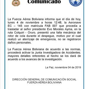 La Fuerza Aérea Boliviana (FAB) comunicó este lunes que un helicóptero que trasladaba al presidente Evo Morales desde Colquiri hacia la ciudad de Oruro sufrió una falla mecánica y tuvo que realizar un aterrizaje de emergencia. El mandatario salió ileso del incidente.