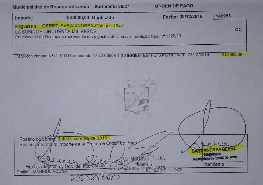 #RosarioDeLerma Durante el breve interinato Sara Andrea Gerez como titular del municipio de Rosario de Lerma en reemplazo de Jarsún se firmó y cobro una resolución de 50.000 pesos para cubrir supuestos gastos de representación del municipio.