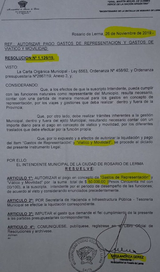 La Intendenta interina de Rosario de Lerma cumplió solamente 12 días en esa función. Voces Críticas pudo acceder a la Resolución N° 1126/19 del 26 de Noviembre 2019 que redacta que para que la “suscripto intendente pueda cumplir con las funciones naturales como representante del Municipio, resulta necesario contar con una partida mensual para los gastos en concepto de representación por los viajes y gestiones que deba realizar dentro y fuera de la Provincia”, resolviéndose “autorizar el pago en concepto de “Gastos de Representación” y “Viático y Movilidad” por la suma total de $50.000 (Pesos Cincuenta mil con 00/100 a las suscripta, Intendente por el periodo de desempeño de las funciones de acuerdo al visto y considerando enunciados precedentes”.