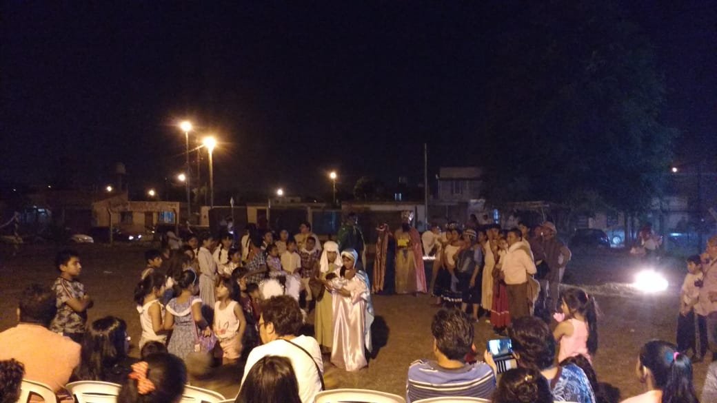 Ante la atenta mirada de todos los vecinos, la función comenzó a las 21 hs al lado del playón de dicho barrio, donde se montó escenografía acorde a la época, al igual que la vestimenta, además de preparar diferentes coreografías y cánticos que revivieron lo que sucedió aquella noche en Belén.