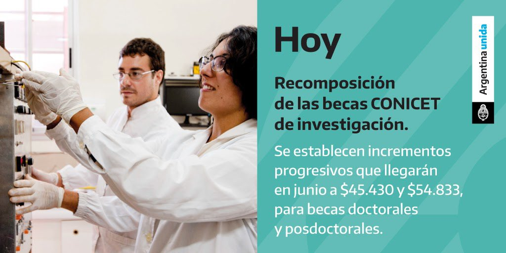 Tras reunirse con el presidente Alberto Fernández, el jefe de Gabinete Santiago Cafiero y el ministro de Ciencia, Tecnología e Innovación, Roberto Salvarezza, anunciaron un plan de recomposición de las becas doctorales y posdoctorales del Consejo Nacional de Investigaciones Científicas y Técnicas (CONICET) y la Agencia Nacional de Promoción Científica y Tecnológica.