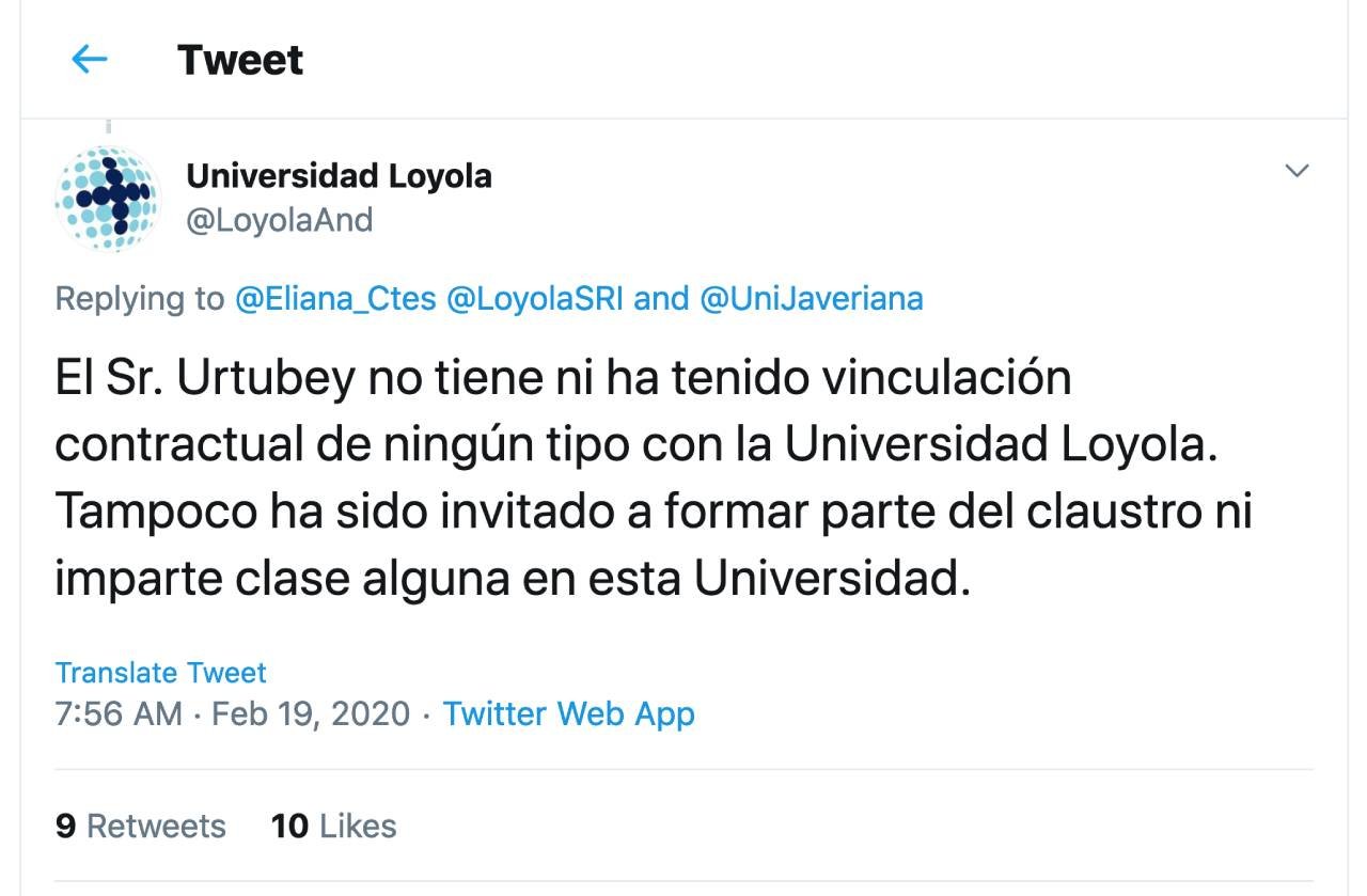“El Sr. Urtubey no tiene ni ha tenido vinculación contractual de ningún tipo con la Universidad Loyola. Tampoco ha sido invitado a formar parte del claustro ni imparte clase alguna en esta Universidad”.
