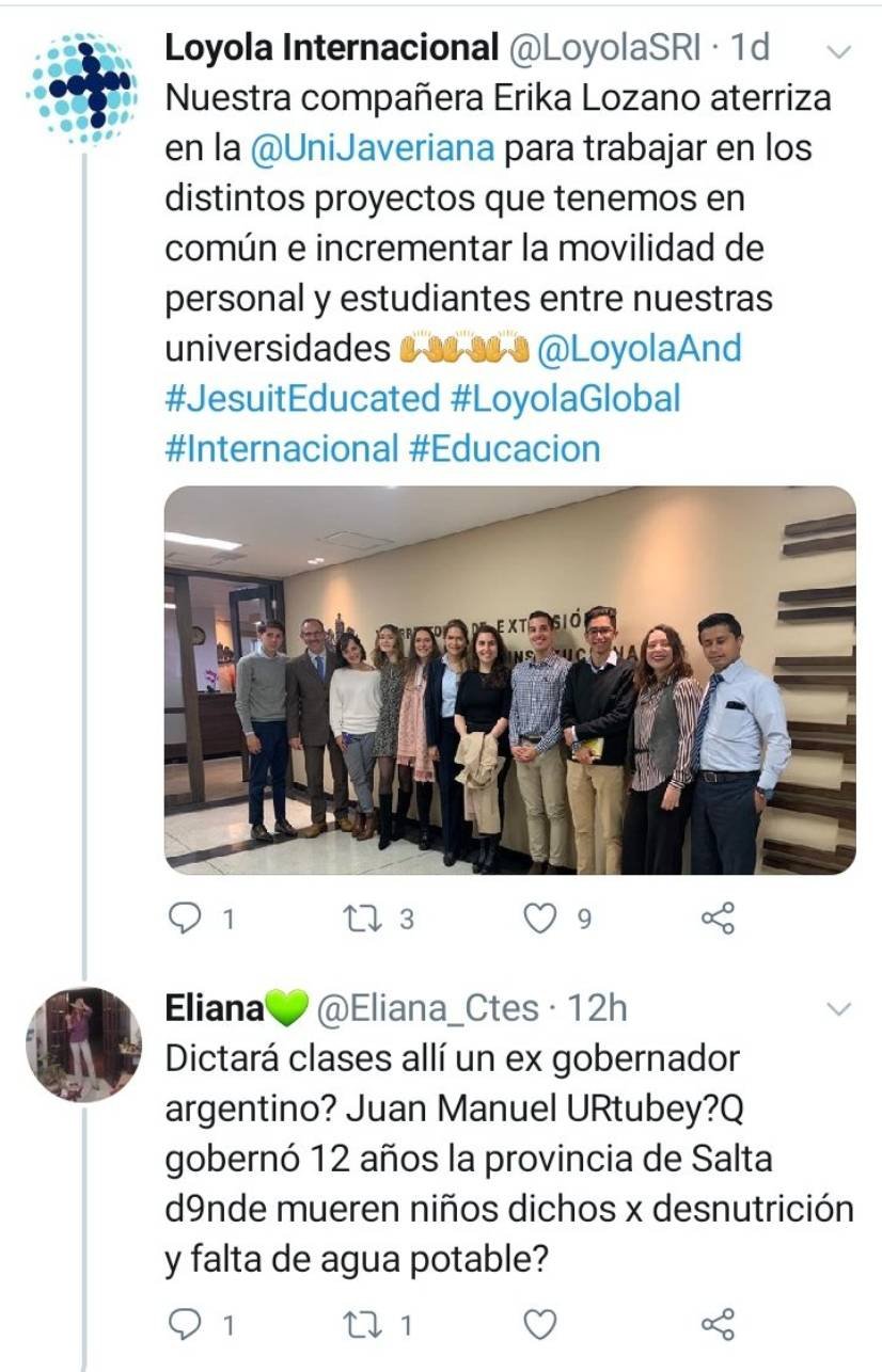 Una internauta argentina (@eliana_ctes) ha utilizado la red Twitter para dirigirse a la Universidad Loyola Andalucía y preguntarle si el exgobernador de Salta impartirá clases en ese centro universitario, tal cual él mismo y su entorno más cercano se encargaron de anunciar en la Argentina, poco antes de finales del año pasado.