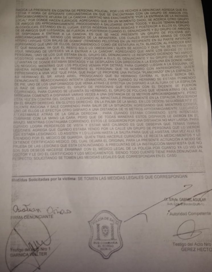 En la tarde del domingo en inmediaciones del Club Libertad de Campo Santo, un grupo de simpatizantes se encontraban reunidos de manera pacífica, antes de ingresar a presenciar un partido de fútbol, de repente se hizo presente personal policial, que de manera amenazante y autoritaria, le ordenaron retirarse del lugar, en vano fueron las explicaciones hacia los policías, quienes comenzaron una feroz represión, hiriendo a muchos de ellos, disparándole incluso de atrás, ya que dos de los muchachos presentan heridas en la espalda.