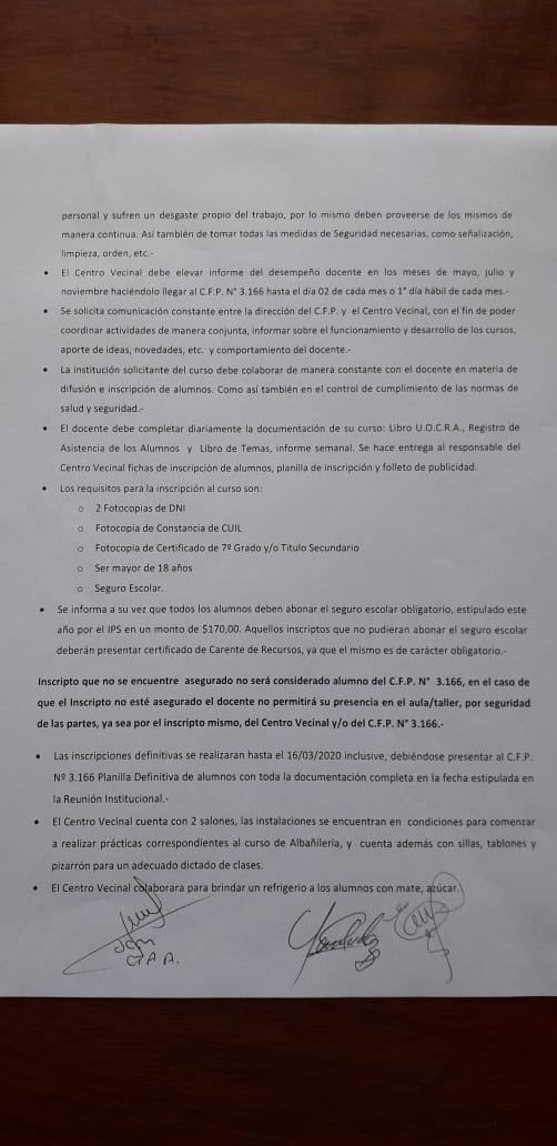 En el día de ayer la CTA Autónoma Salta, Centro vecinal Bº Las Tunas firmó un convenio con el centro de formación profesional Nº3166 con el objetivo de que se puedan dictar Cursos de capacitación teórico práctico de albañilería, dichos cursos podrán realizarlos los vecinos de los 24 barrios de la Ruta 26 además de fincas y parajes. Este curso lo certifica el Ministero de Educación y la UOCRA, tiene una duración de 4 meses.
