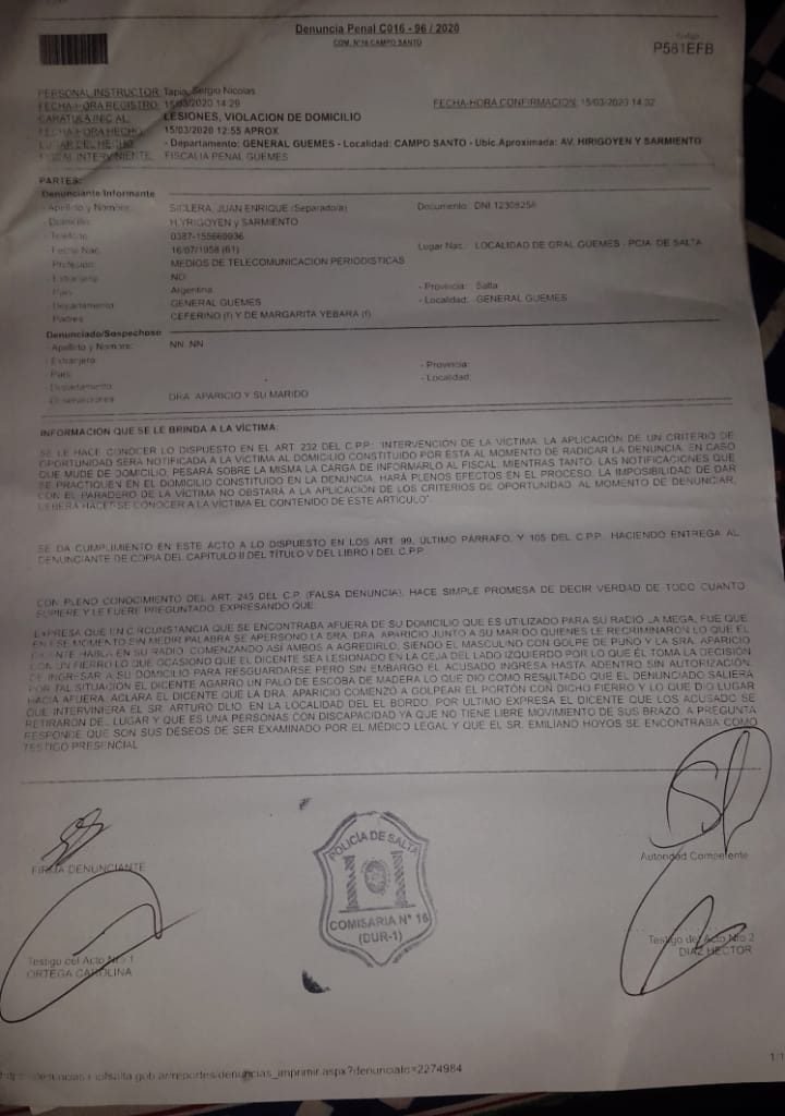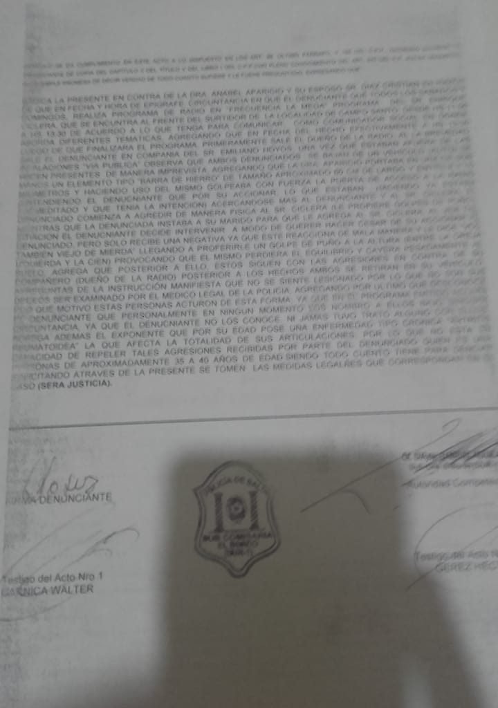 Muy buenas noches a toda la audiencia del Canal Siete de Salta, bueno por acá con algunos dolores, hemos sido agredidos, por una abogada, su marido y un tal hechicero que es uno de los gremialistas. Hemos sido lastimados por ellos.