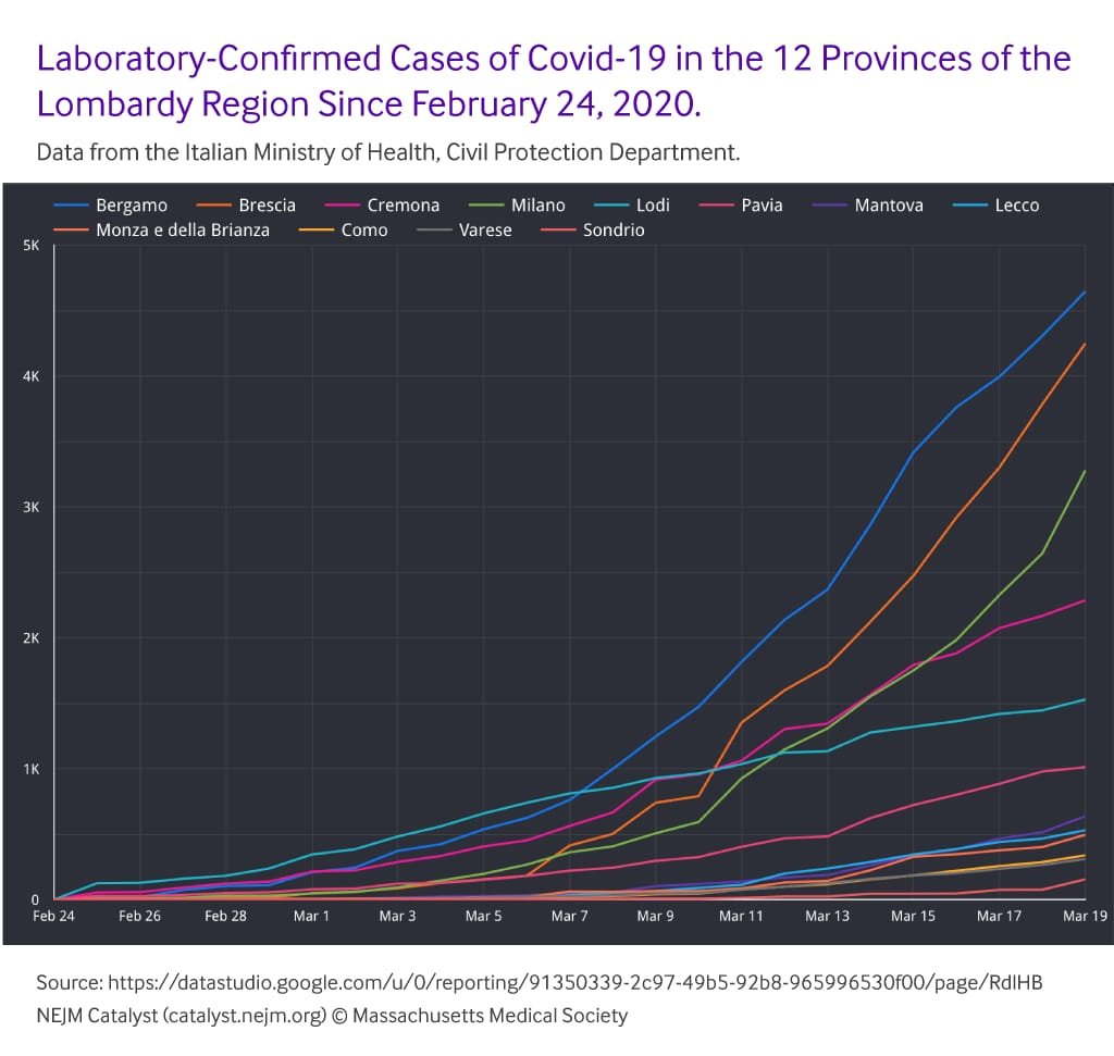 Nosotros trabajamos en el Hospital Papa Giovanni XXIII en Bérgamo, una nueva instalación de última generación con 48 camas de cuidados intensivos. A pesar de ser una ciudad relativamente pequeña, este es el epicentro de la epidemia italiana, enumerando 4,305 casos en este momento, más que Milán o en cualquier otro lugar del país (Figura 1). Lombardía es una de las regiones más ricas y densamente pobladas de Europa y ahora es la más afectada. La Organización Mundial de la Salud (OMS) notificó 74.346 casos confirmados por laboratorio en Europa el 18 de marzo, 35.713 de ellos en Italia. Nuestro propio hospital está muy contaminado, y estamos mucho más allá del punto de inflexión: 300 de cada 900 camas están ocupadas por pacientes con Covid-19. El 70% de las camas de la UCI en nuestro hospital están reservadas para pacientes críticos con Covid-19 con una posibilidad razonable de sobrevivir. La situación aquí es triste ya que operamos muy por debajo de nuestro estándar de atención normal. Los tiempos de espera para una cama de cuidados intensivos son largas horas. Los pacientes mayores no están siendo resucitados y mueren solos sin los cuidados paliativos apropiados, mientras que la familia es notificada por teléfono, a menudo por un médico bien intencionado, agotado y emocionalmente agotado sin contacto previo. Pero la situación en los alrededores es aún peor. La mayoría de los hospitales están superpoblados, llegando al colapso, mientras que los medicamentos, ventiladores mecánicos, oxígeno y equipo de protección personal no están disponibles. Los pacientes yacían en los colchones del piso. El sistema de atención médica tiene dificultades para brindar servicios regulares, incluso atención del embarazo y parto, mientras que los cementerios están abrumados, lo que creará otro problema de salud pública. En los hospitales, los trabajadores de la salud y el personal auxiliar están solos, tratando de mantener el sistema operativo. Fuera de los hospitales, se descuidan las comunidades, los programas de vacunación están en espera y la situación en las cárceles se está volviendo explosiva sin distanciamiento social. Hemos estado en cuarentena desde el 10 de marzo. Desafortunadamente, el mundo exterior parece ignorar que en Bérgamo, este brote está fuera de control.