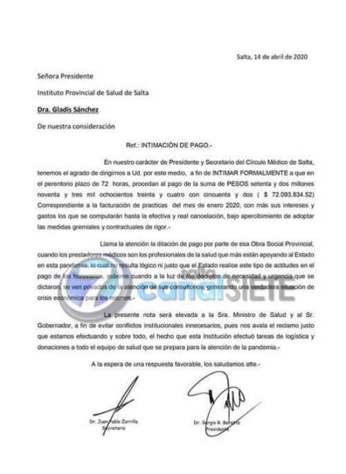 El Círculo Médico de Salta intimó formalmente al IPSS (Instituto Provincial de Salud de Salta) a que en un plazo de 72 horas procedan al pago de la deuda correspondiente a la facturación de prácticas del mes de enero de 2020.