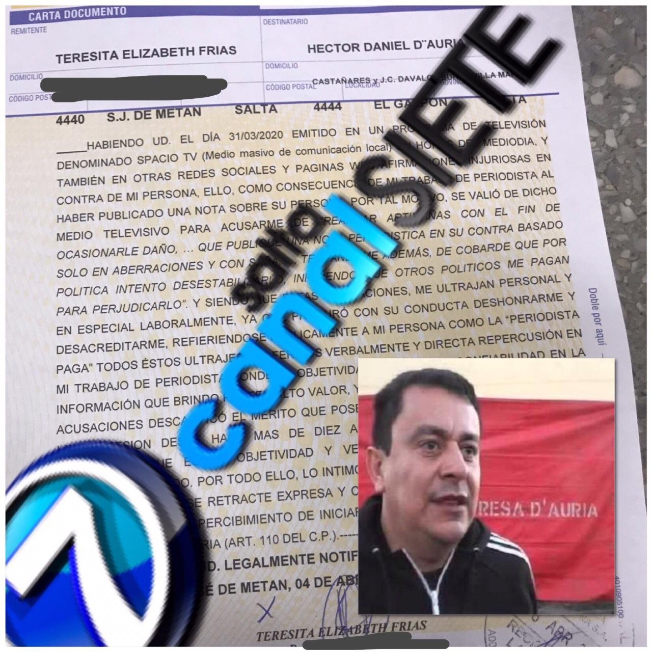 El senador Héctor Daniel D’Auría acusó a nuestra colega, la periodista Teresita Frias de “hacerle una cama política junto a otros legisladores” luego de que ella cubriera y realizara una nota en la que muestra al senador violando la cuarentena impuesta por el gobierno nacional. Por esta razón es que se decide emitir una Carta Documento solicitando al Legislador del Sur de Salta “disculpas públicas por las injurias y difamaciones vertidas hacia su persona”, hasta el momento, D’Auria no emitió ninguna respuesta.