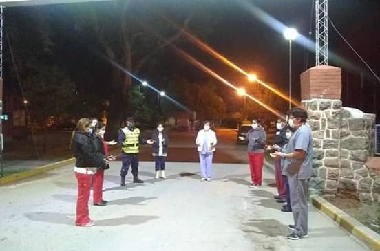 Güemes: El ejército de oraciones Médicos, Enfermeros, Policías, Chóferes, y Camilleros orando por el mundo en la entrada del hospital “Joaquín Castellanos”.