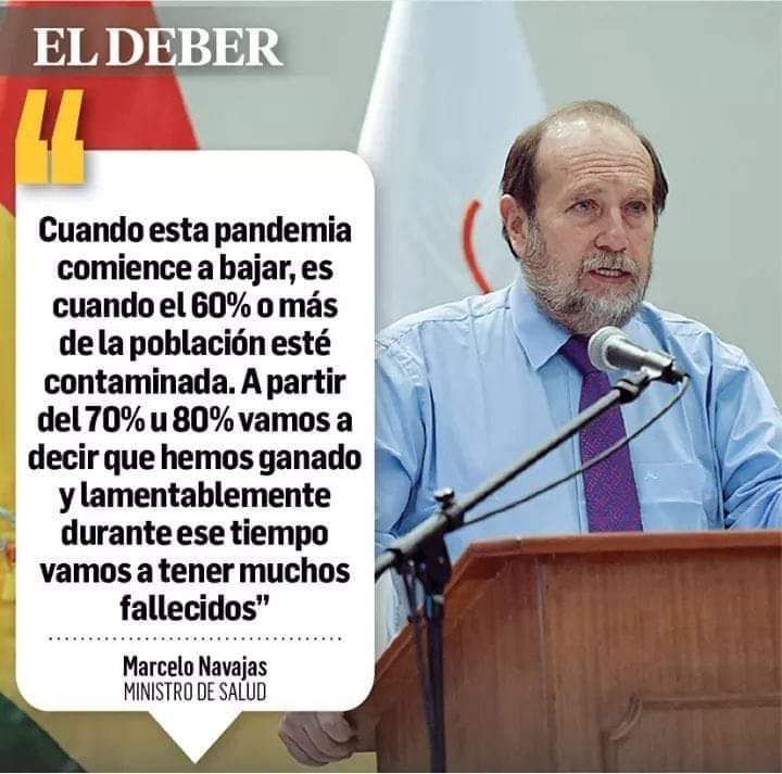 El Ministro de Salud del Estado Plurinacional de Bolivia, Marcelo Navajas, declaró que la pandemia en Bolivia comenzará a descender cuando el 70% u 80% de la poblacion se encuentre contaminada y existan muchos fallecidos.