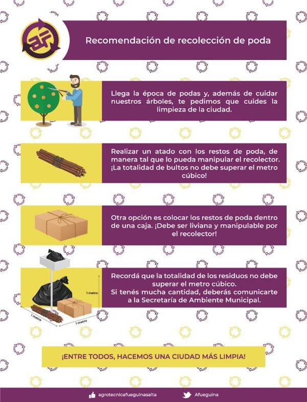 Se recomienda no tirar restos de podas en las esquinas o espacios públicos, sino acondicionarlos en cajas, bolsas o atados pequeños para que sean recolectados por el servicio de recolección domiciliaria del frente de los domicilios.