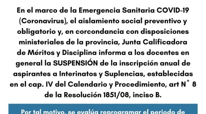 Desde la Asociación Docente Provincial, uno de los gremios más grande de Salta, que núclea a la mayoría de los docentes, informaron que en el marco de la emergencia sanitaria actual por el coronavirus, el aislamiento social, preventivo y obligatorio, y en concordancia con las disposiciones ministeriales de la provincia, la Junta Calificadora de Méritos y Disciplina informa a los docentes en general la suspensión de la inscripción anual de aspirantes a interinatos y suplencias, establecidas en el capítulo IV, del calendario y procedimiento, artículo n° 8, de la resolución 1851/08, inciso B.