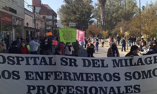El martes a la mañana el tránsito del microcentro salteño se vio interrumpido en varias cuadras por trabajadores de hospitales y centros de salud. Desde la Plaza 9 de Julio partió una caravana de profesionales que visibilizaron la falta de pago del bono de los $20.000 que debía abonarse en cuatro cuotas por parte de Nación.