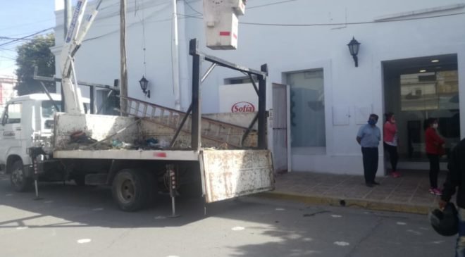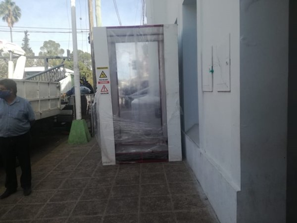 La cámara de desinfección donada por la empresa Sofía. La misma, se construyó en el marco de la emergencia sanitaria como una alternativa para evitar la expansión del covid-19 y está ubicada al costado del Banco Macro, en la capital güemense.