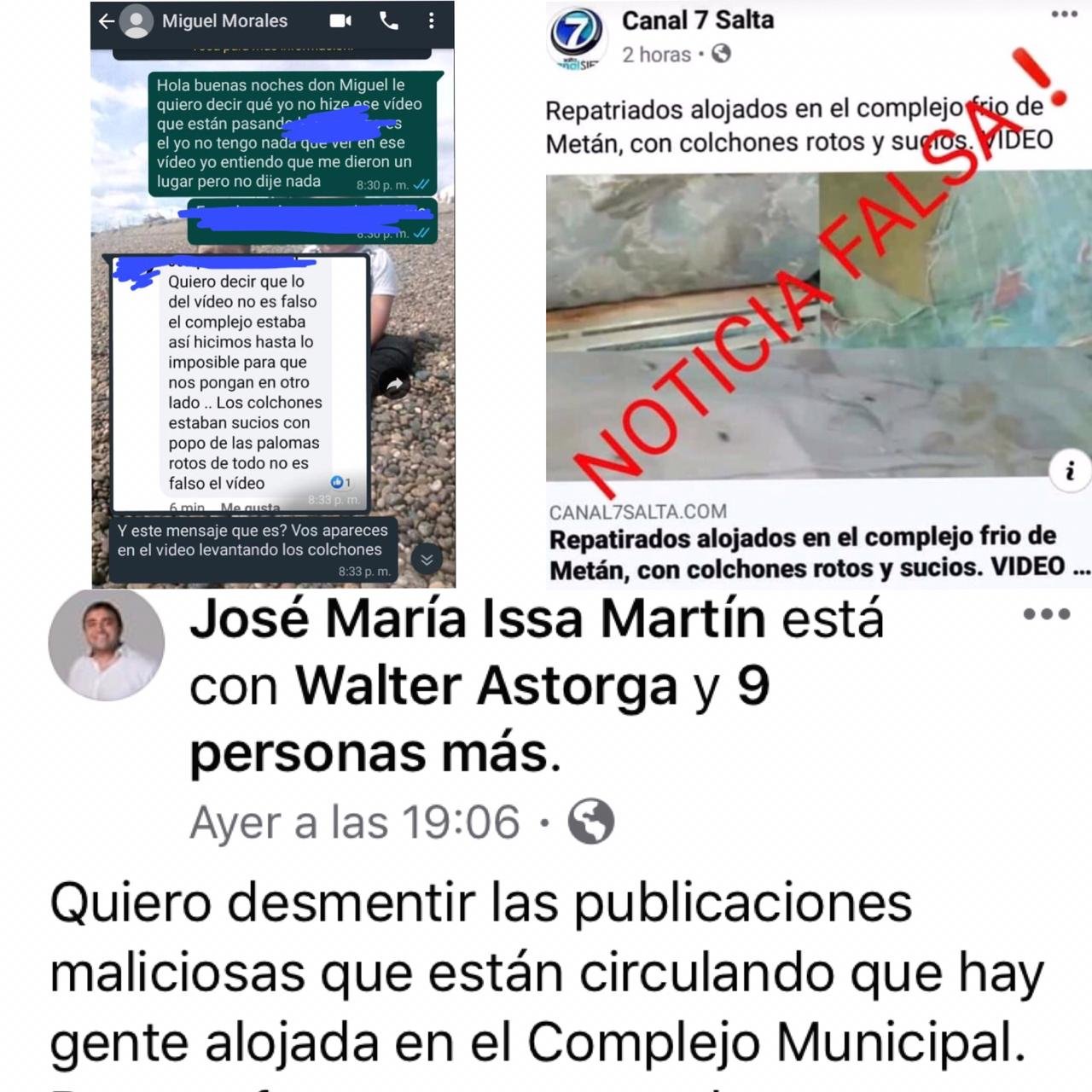Asimismo, el Jefe comunal Issa también desmintió categóricamente y señaló de “noticias maliciosas” al video que mostramos. No tardaron en salir periodistas oficialistas de esa localidad y empleados municipales salieron a desmentir al propio repatriado subiendo en sus estados una captura de Canal 7 Salta con la leyenda:“fake news, noticia falsa”.