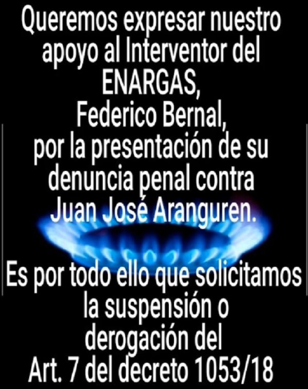 Queremos expresar nuestro apoyo al Interventor del ENARGAS, Federico Bernal, por la presentación de su denuncia penal contra Juan José Aranguren, ex Ministro de Energía y Minería (MINEM), Marcos Porteau, ex Subsecretario de Recursos Hidrocarburíferos del MINEM, y los y las integrantes del ex Directorio del Ente por la posible comisión de los delitos de incumplimiento de los deberes de funcionario público y negociaciones incompatibles con la función pública, artículos 248 y 265 del Código Penal.