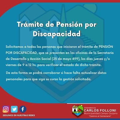 Desde la Municipalidad de Campo Quijano, solicitan a todas las personas que iniciaron el trámite de PENSIÓN POR DISCAPACIDAD, que se presenten en las oficinas de la Secretaría de Desarrollo y Acción Social (25 de mayo 499), los días jueves y/o viernes de 9 a 12 hs. para verificar el estado de dicho trámite.