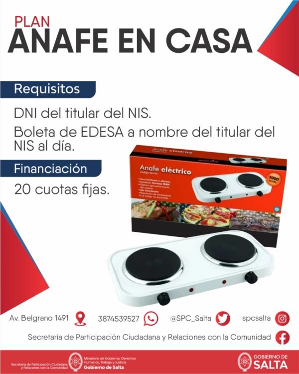 Consiste en la provisión y financiamiento de un Anafe Eléctrico de dos hornallas, financiando su precio en hasta 20 cuotas sin interés con la factura de luz.