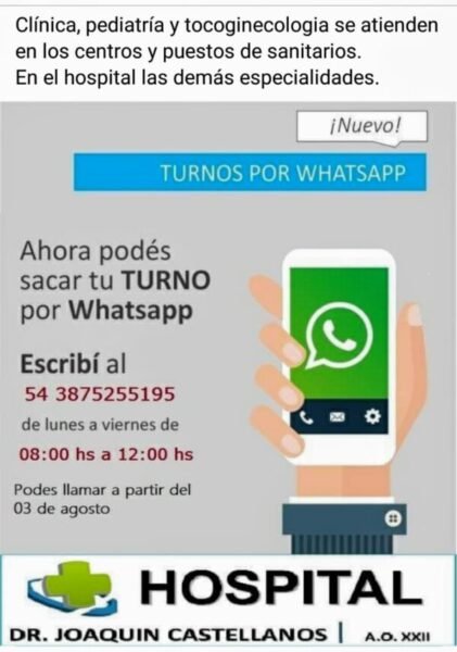 Salta – Gral. Güemes: Ahora se podrá conseguir turnos para el Hospital Joaquín Castellanos por WhatsApp