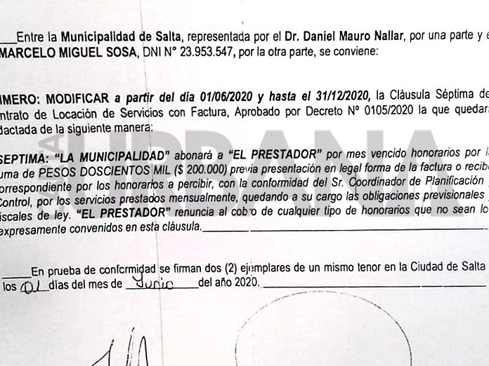 Después de las formalidades de redacción, el decreto dispone en su artículo primero “APROBAR la addenda al Contrato de Locación de Servicios bajo la modalidad Con Factura, celebrado entre la Municipalidad de la Ciudad de Salta y el Sr. Marcelo Miguel Sosa, aprobado por Decreto Nº 0105/2020, la que se adjunta y forma parte del presente”.