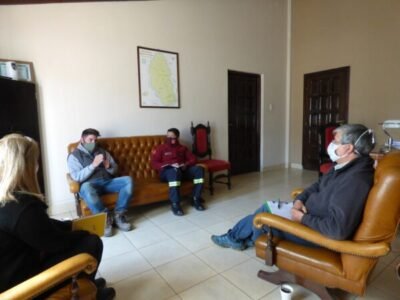 La secretaria de Gobierno, Patricia Herrera junto al director de Medio Ambiente, Facundo Quintana y Martín Padilla de Defensa Civil Municipal, se reunieron con el Comisario Delgado de la división de Bomberos voluntarios de Campo Quijano para coordinar desinfecciones en el pueblo y en La Silleta y alrededores.