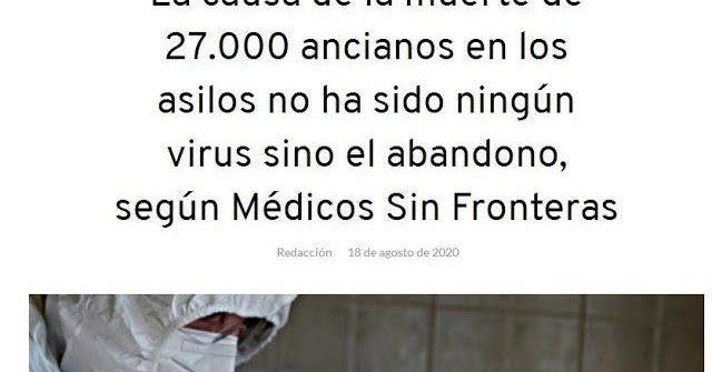 Se confirman nuestras sospechas, no solo no murieron de COVID, ademas por el panico y la falsa alarma provocada por los medios de desinformación complcies de la matanza a sabiendas o no, el numero de ancianos ASESINADOS HA SIDO DE 27.000 Y NINGUNO DE ELLOS MURIO POR COVID fueron asesinados abandonados EUTANASIA GERONTICIDIO y si no hacemos nada volveran hacerlo en septiembre otra matanza indiscriminada de personas solas abandonadas y en el mejor de los casos con paliativos para que su muerte por EUTANASIA sea con sedacion ESTO ES DIABOLICO ATROZ HORRIBLE UN CRIMEN DE ESTADO.