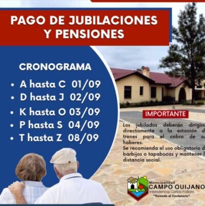 De acuerdo a la información provista por la Municipalidad de Campo Quijano, el cobro de los haberes se realizará en la estación de trenes, también se realizará la recepción de los DNI. Se pide a los abuelos utilizar el barbijo o cubrebocas, respetar la distancia social y utilizar alcohol en gel.