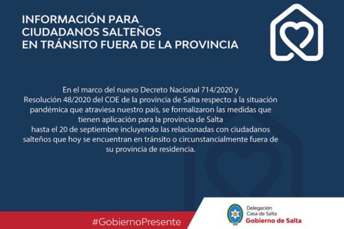 Hasta el 20 de septiembre, Salta aplica las restricciones que emanan del Decreto nacional 714/2020 y de la Resolución provincial de COE 48/ 2020, vinculadas a la pandemia por coronavirus y que afecta a los ciudadanos salteños residentes y en tránsito. Se encuentra vigente la limitación de ingreso de personas a Salta, estableciendo un esquema de ingresos controlados a cargo de la Central Operativa de Control y Seguimiento COVID19 (COCS) para situaciones y casos de carácter sanitario, humanitario o de vulnerabilidad y de personas en tránsito.