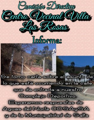 A través de un comunicado, los representantes del Centro Vecinal de Villa Las Rosas, informaron mediante las redes sociales, los reclamos que realizaron ante Aguas del Norte y la dirección de obras públicas municipal. A continuación, se reproduce textualmente el contenido: