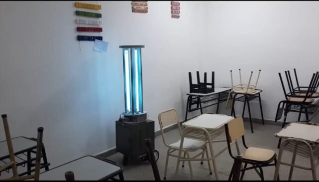 El robot uv desarrollado por los alumnos de la escuela técnica 3106 tiene el objetivo de esterilizar ambientes de riesgo y combatir así la pandemia provocada por el coronavirus. El robot emite luz ultravioleta capaz de eliminar prácticamente todos los virus, bacterias y microorganismos.
