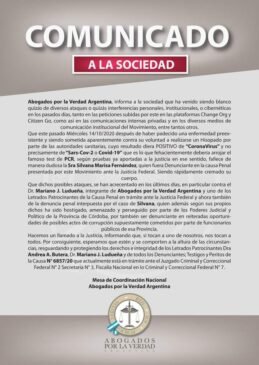 Hacemos un llamado a la Justicia, informando que, si tocan a uno de nosotros, nos tocan a todos. Por consiguiente, esperamos que estén y se comporten a la altura de las circunstancias, resguardando y protegiendo los derechos e integridad de los Letrados Patrocinantes, Dra. Andrea Butera, Dr. Mariano Ludueña, y de todos los denunciantes, testigos y peritos de la Causa N 6857/20 que actualmente está en trámite ante el Juzgado Criminal y Correcional Federal Nª2 y Secretaria Nº3, Fiscalía Nacional en lo Criminal y Correccional Federal Nª7